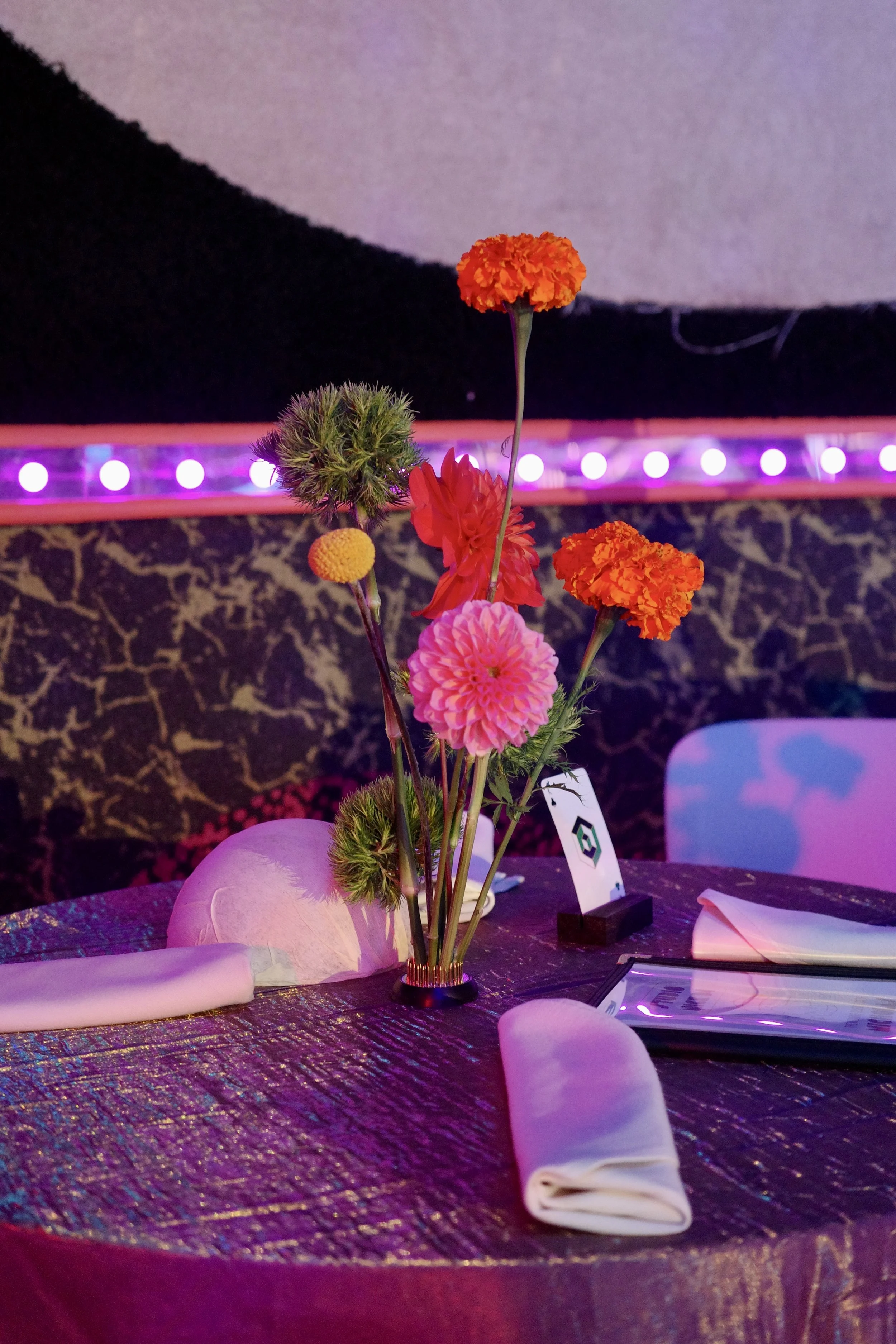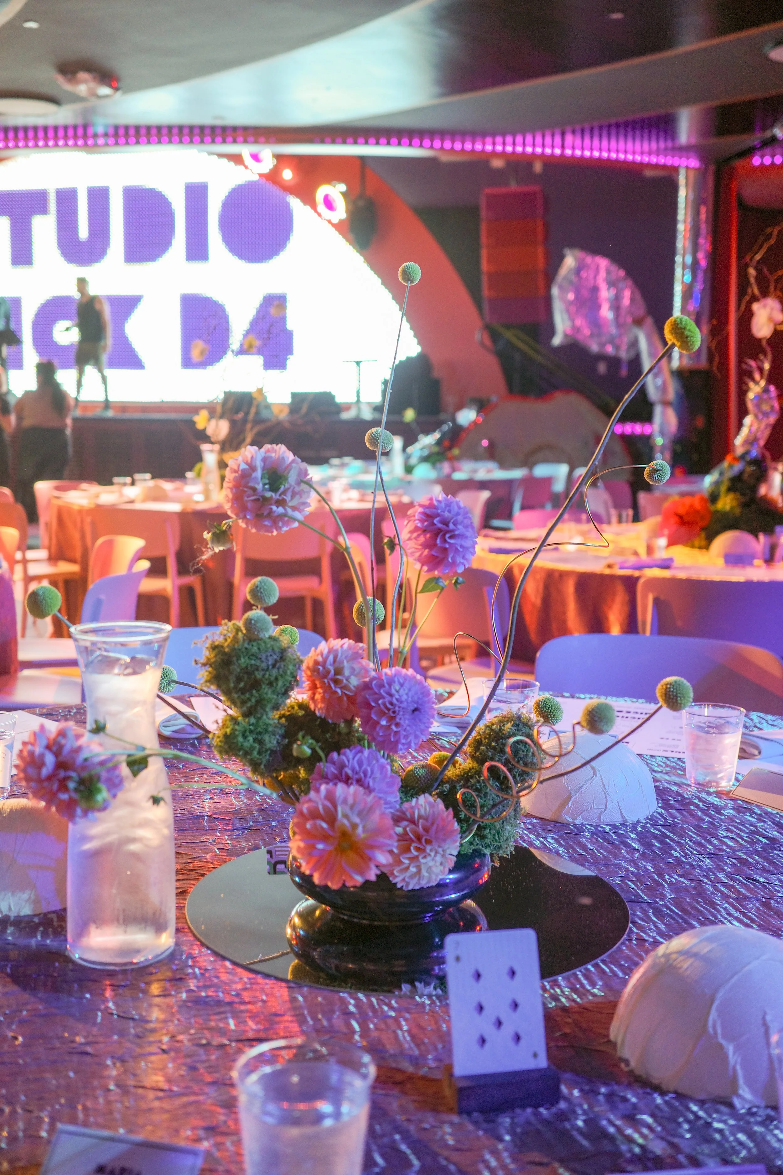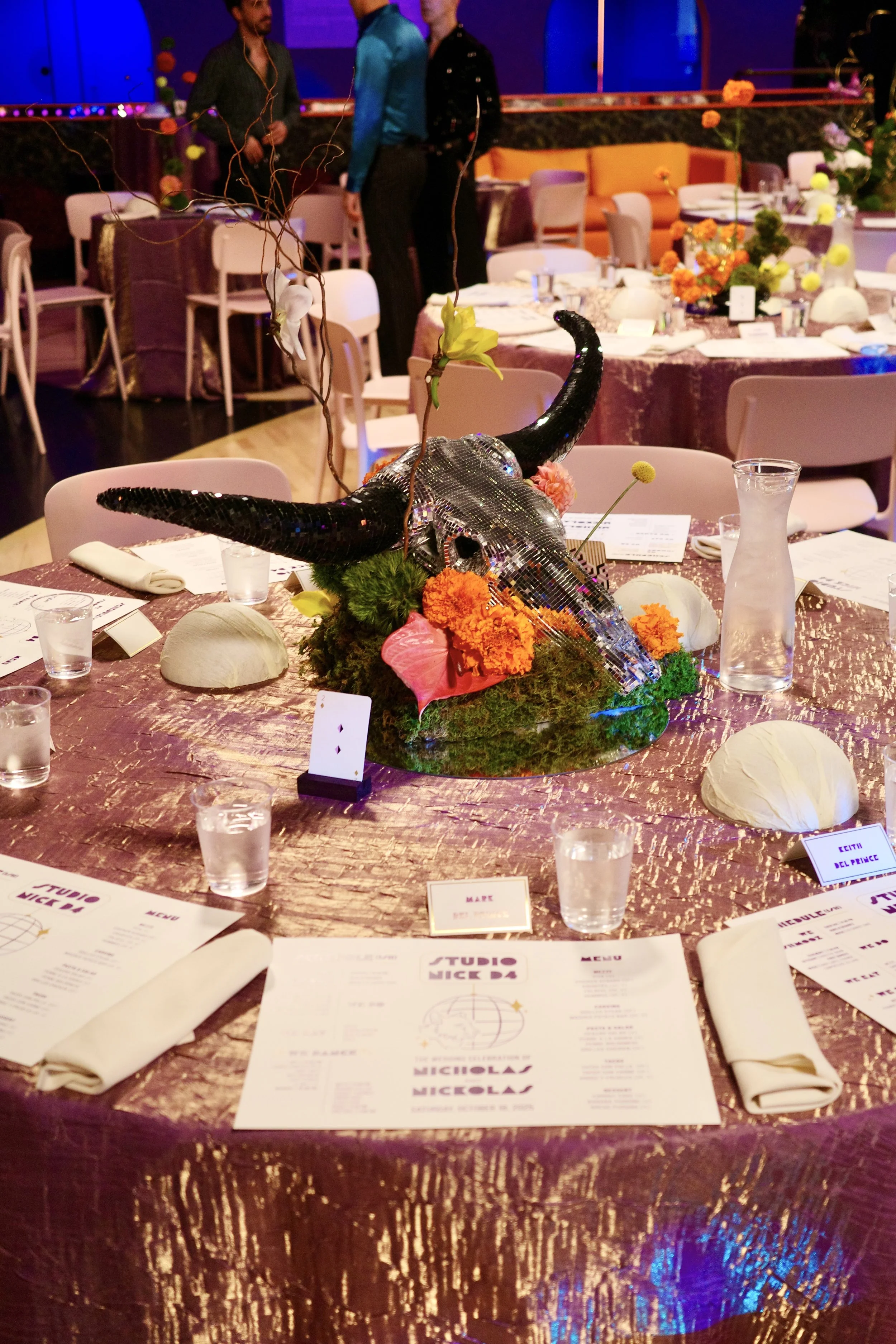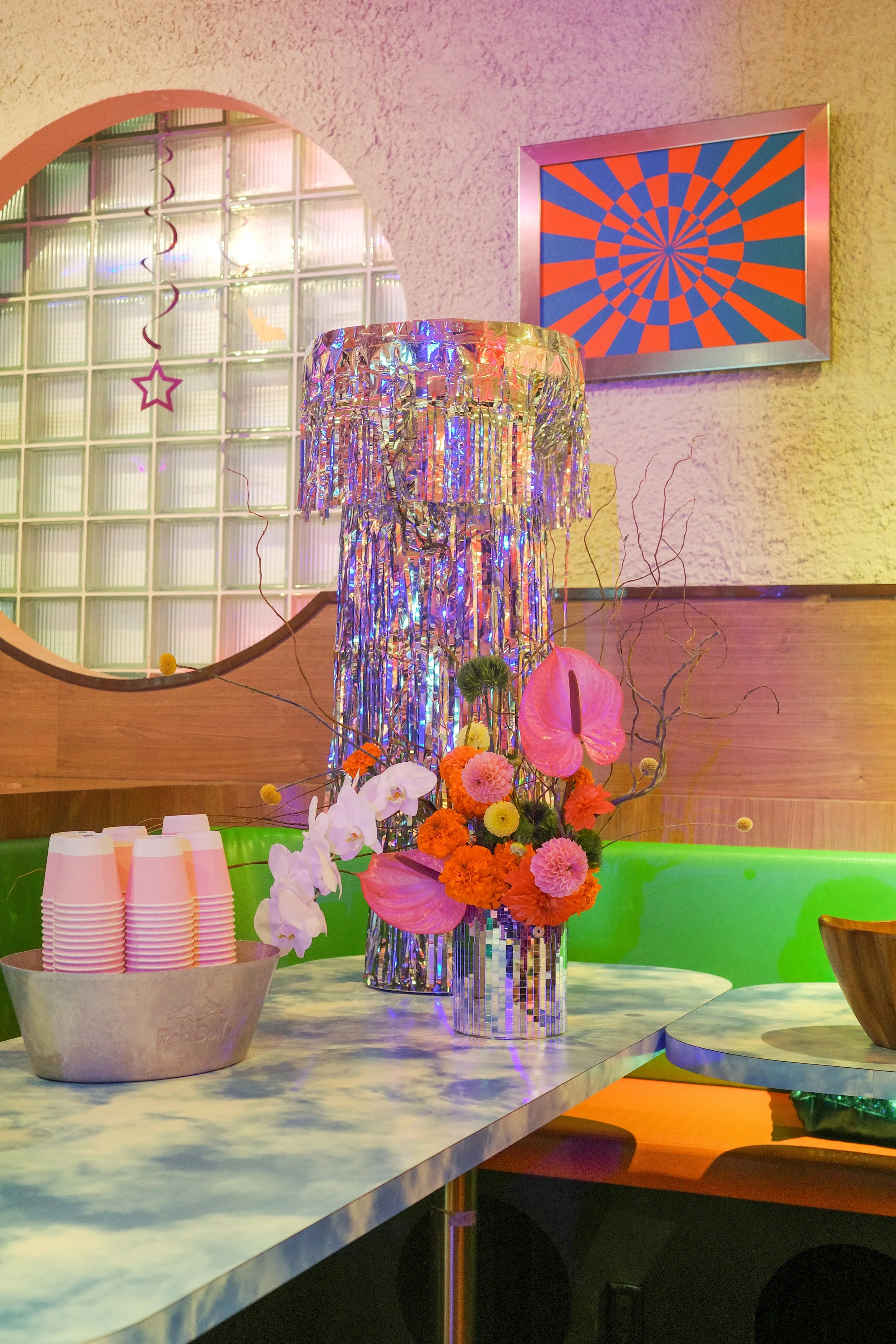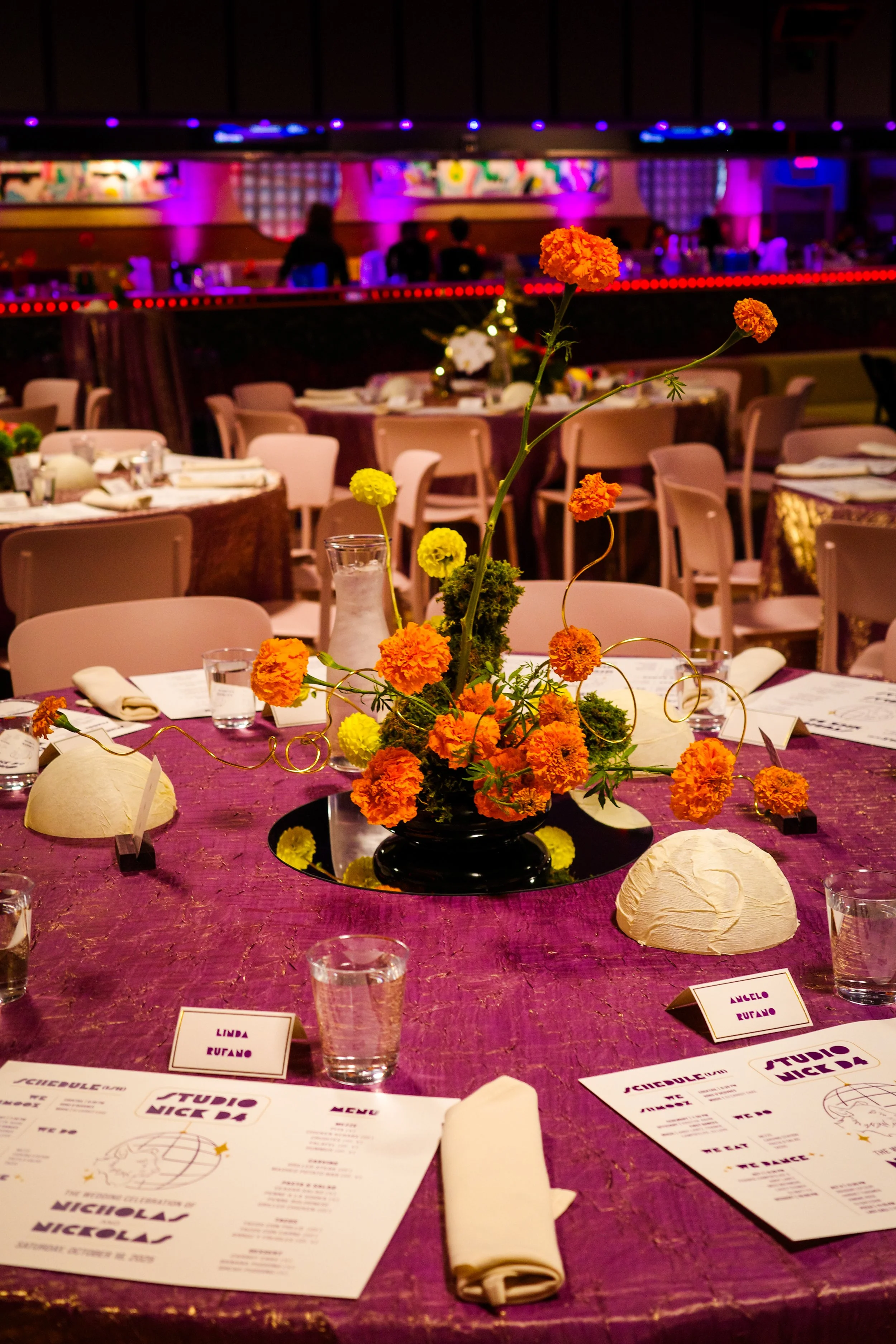 A kaleidoscopic celebration inspired by disco, surrealism, and queer joy. Designed for Nick & Nick, this wedding transformed a roller disco into a living art piece: moss landscapes, wired craspedia, marigolds, and orchids orbiting mirrored sculptures and neon light. Each table became its own playful ecosystem, balancing texture and motion with a wink of camp.
