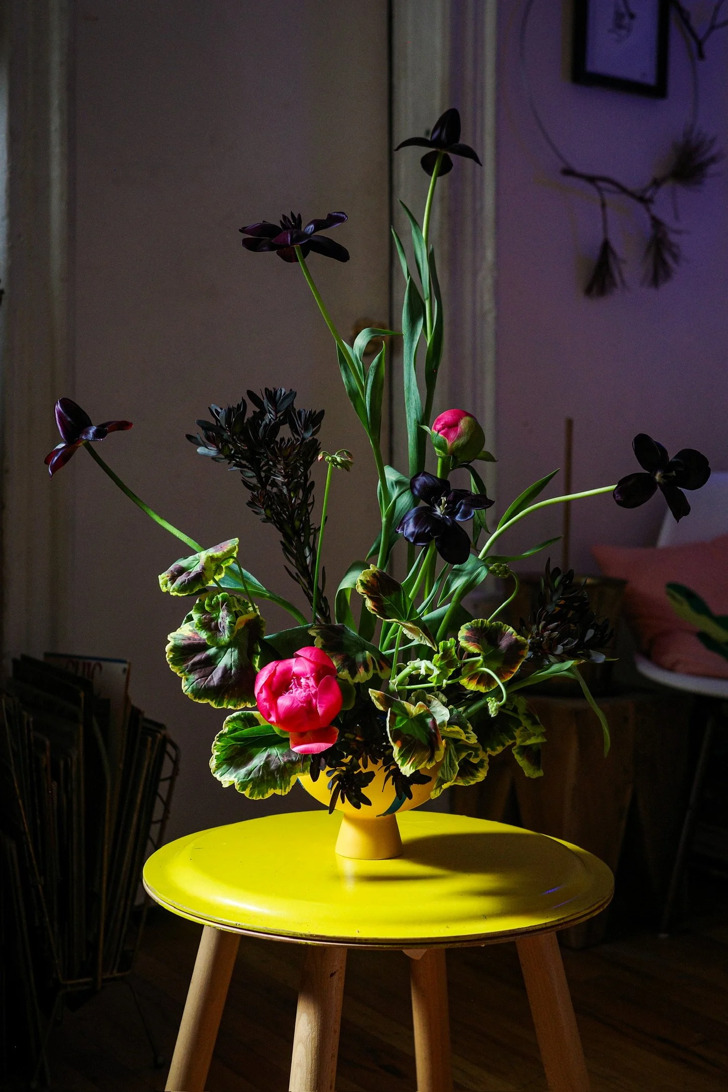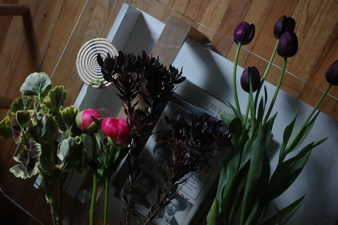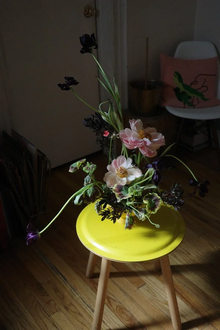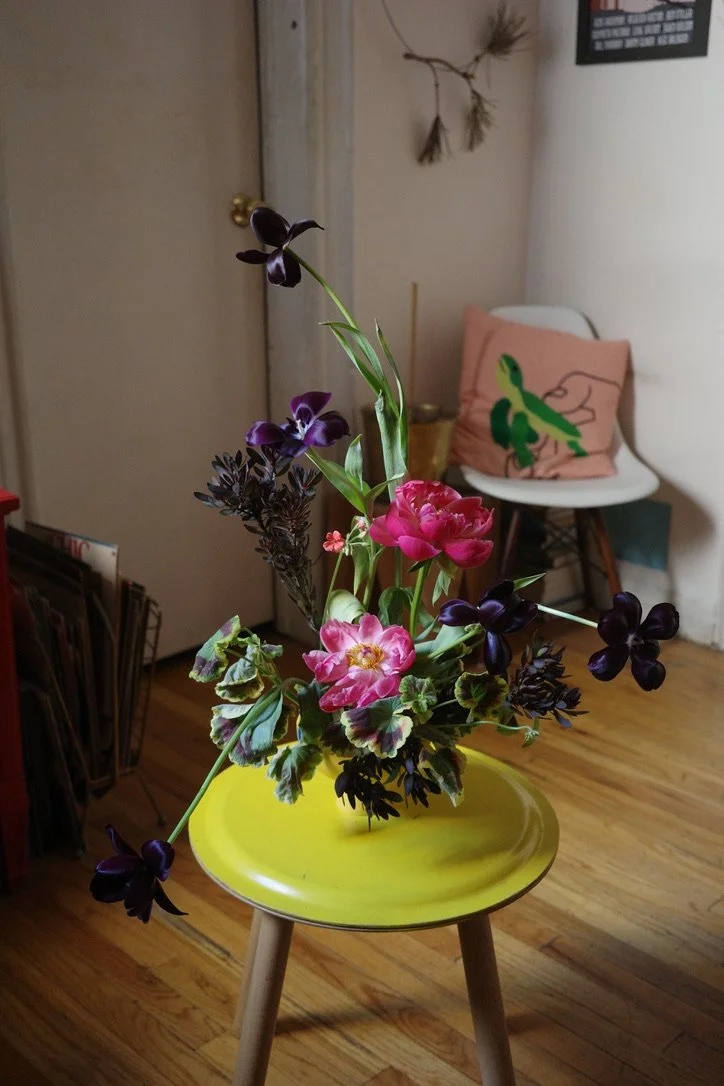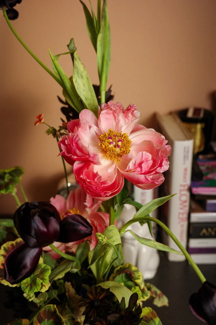 this arrangement has kept changing so much since I first put it together on Friday, 4.4.24. i’m not a huge fan of peonies but when putting together my selection I felt I needed something to contrast the darkness of the tulips (which had bulbs on!) and leucadendron which I chose first. the variegated scented geranium was chosen last, but i think was a perfect foliage to complement all of the flowers beautifully with its multi-colored leaves and pink flowers which bloomed as this arrangement aged
