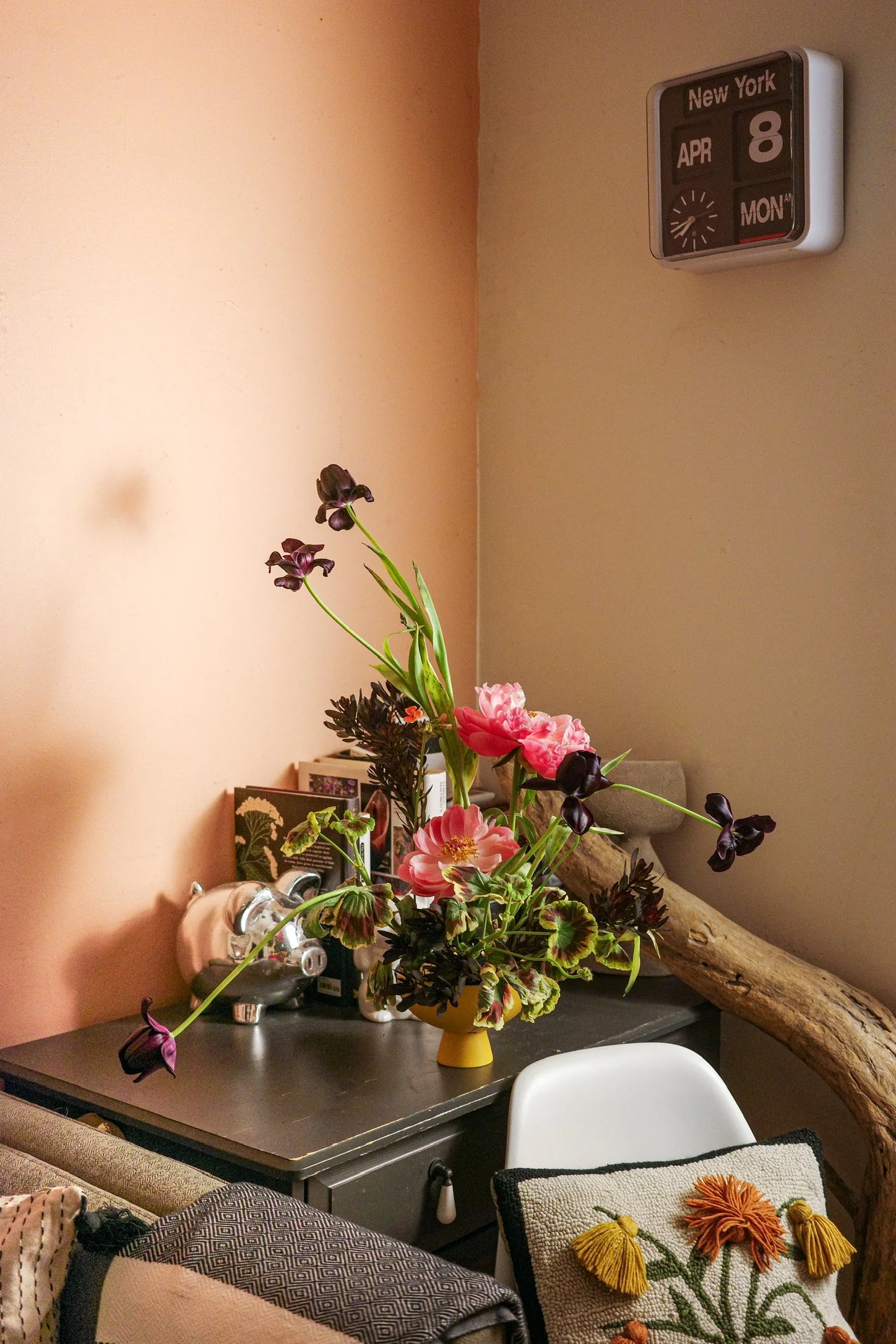 after two days of not being with my flowers, the peonies had opened significantly (still pink), and tulips had shifted. I originally reflexed half of the petals of three and fully reflexed the petals of two. the time that had passed had allowed them to start doing their own thing.